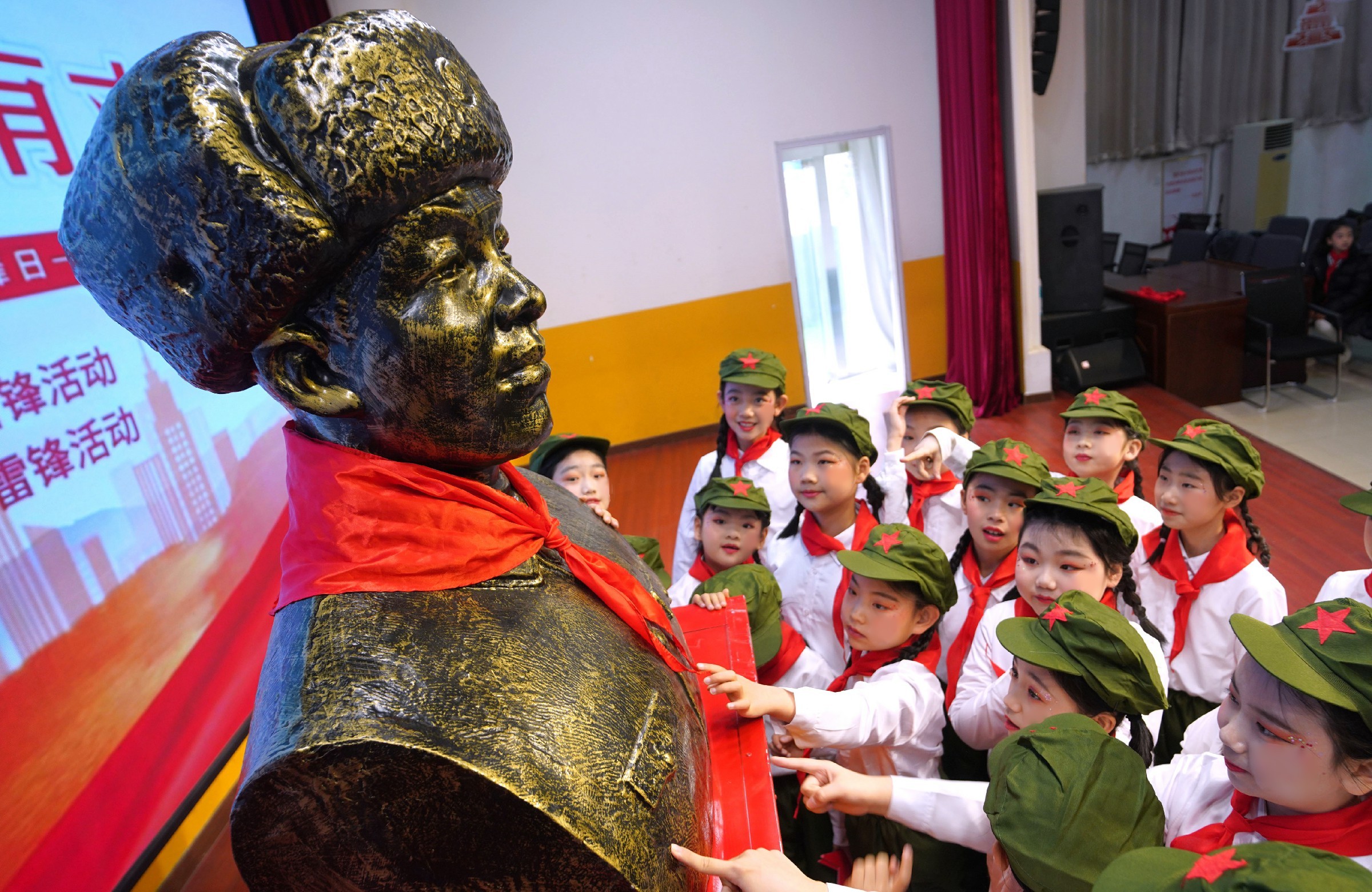 长江东路小学的“小雷锋”围在雷锋塑像前 郑报全媒体记者 马健 摄